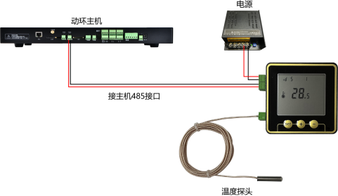 1.温度传感器上有DC12V、RS485①、开关量输入、温度传感器,有4个接口。