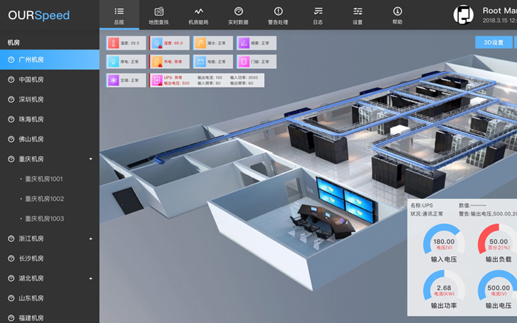 系统可对监测到的各项参数设定越限阀值(包括上下限、恢复上下限),一旦UPS发生越限报警或故障,系统将自动切换到相应的监控界面,且发生报警的该项状态或参数会变红色并闪烁显示,同时产生报警事件进行记录存储并有相应的处理提示,并第一时间发出手机短信、声光等对外报警。