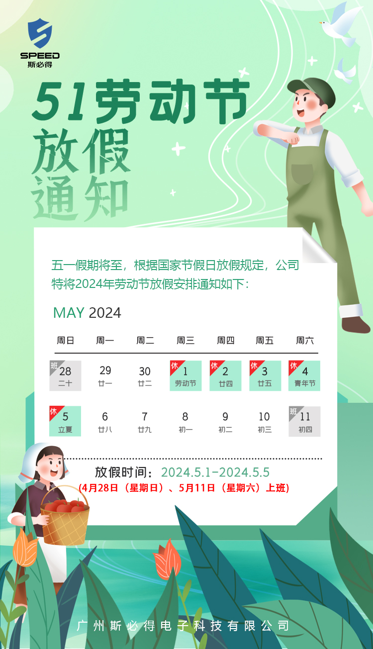 根据相关政策,结合我司实际情况,就2024年五一劳动节做调休放假安排如下,假期期间涉及项目设备的发货、安装、调试等事项均要提前安排,做好对接,特殊情况的需要单独安排。