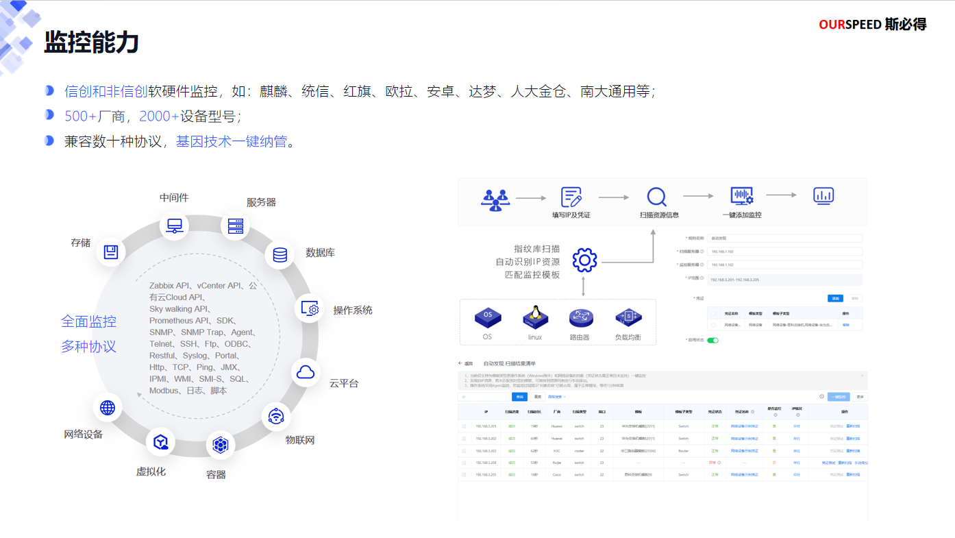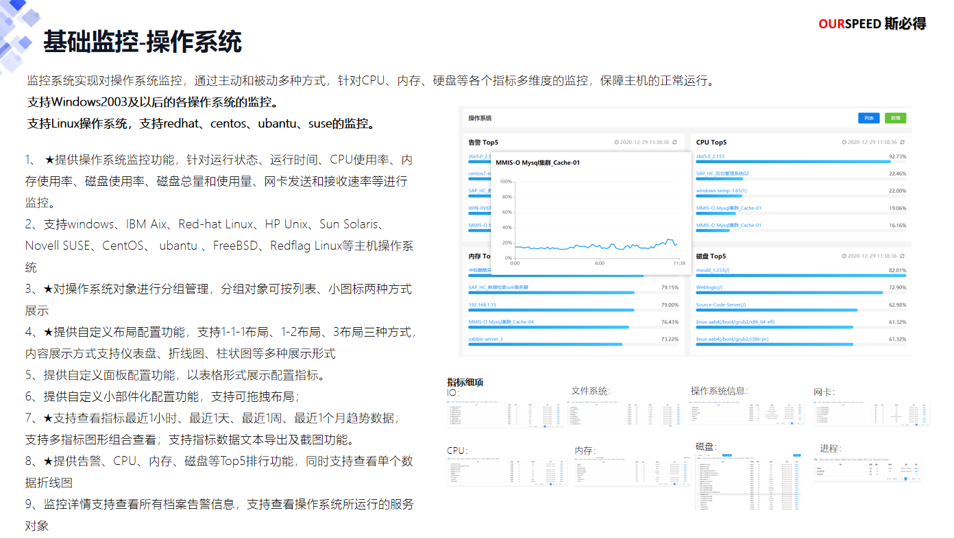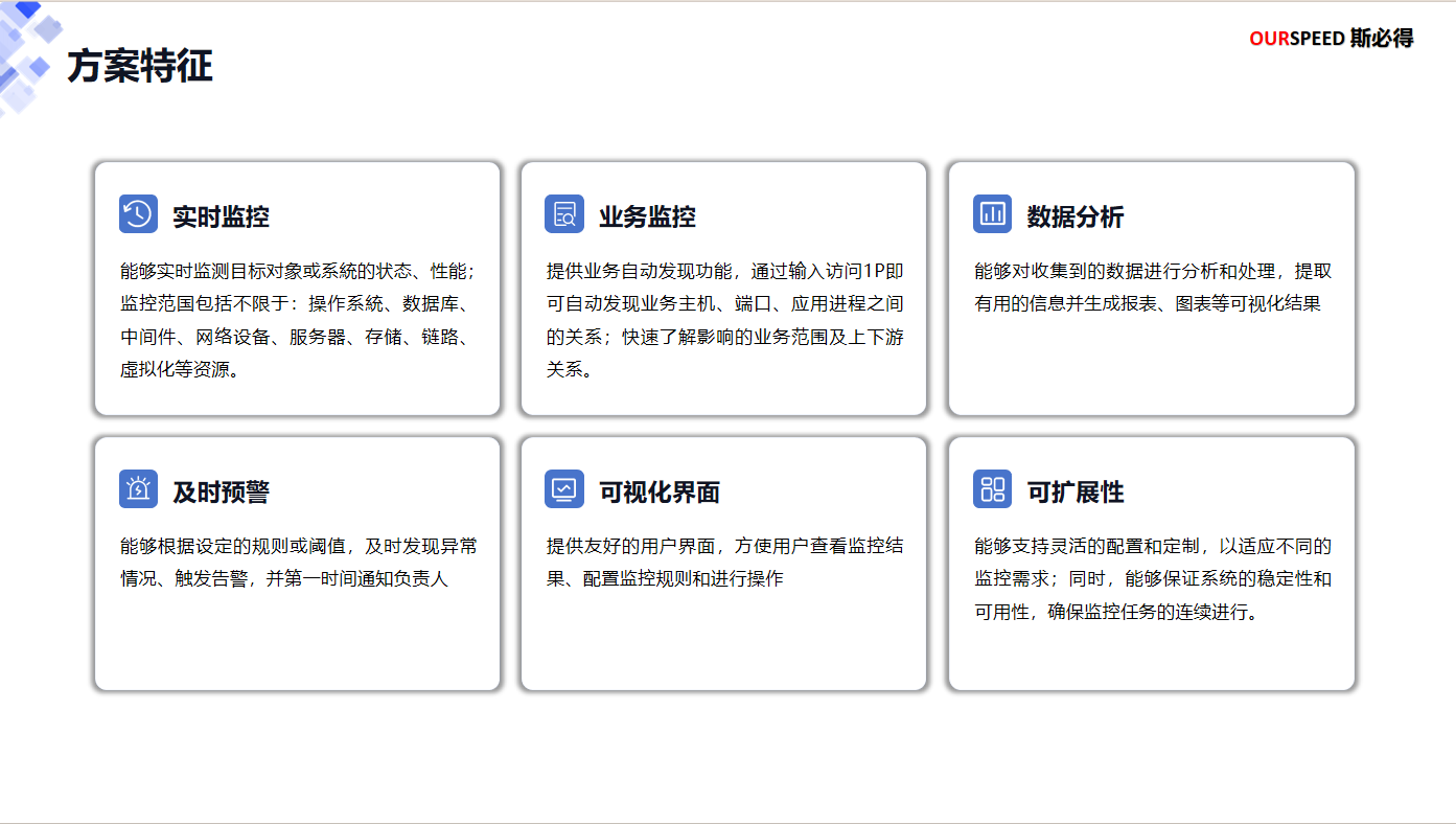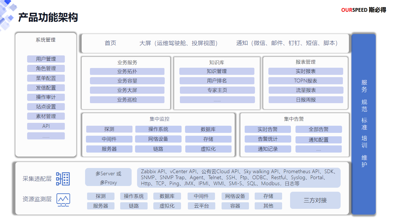 为更好的适应高速业务发展,提高日常运维效率, 提供从IT基础硬件设施、主机系统、小型机系统、网络设备、机房环境、虚拟化、中间件、数据库、摄像头到业务可用性拨测的全链路一站式故障预警监控、性能指标和管理平台,能全面、快速、有效的反应当前IT基础架构和业务系统的健康状态,进一步降低业务宕机风险,保障各业务支撑系统可靠、稳定、高效地运行,进一步提高用户的满意度和忠诚度,全面提升服务质量。