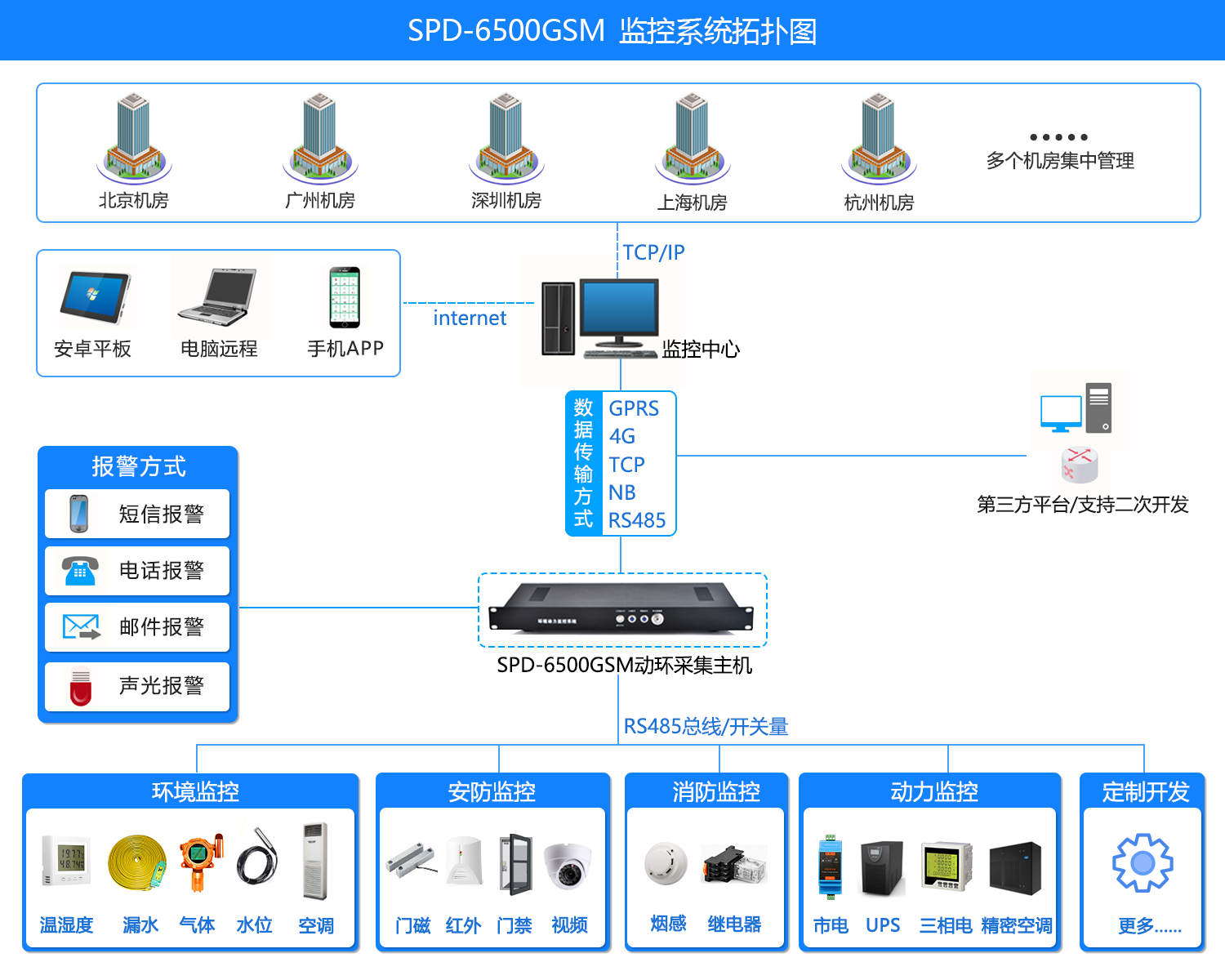 主机自带一路普通空调红外控制,一路温湿度监测,且两者可以实现联动控制。可拓展485和开关量传感器,例如温湿度,区域漏水,烟雾监测,震动监测,三相电量,普通空调,智能照明,门磁监控,红外防盗,市电断电,单相电量,UPS,精密空调,新风机,蓄电池等60多项监控项,支持二次开发能满足所有机房的监控需求以满足现场不同的需求。